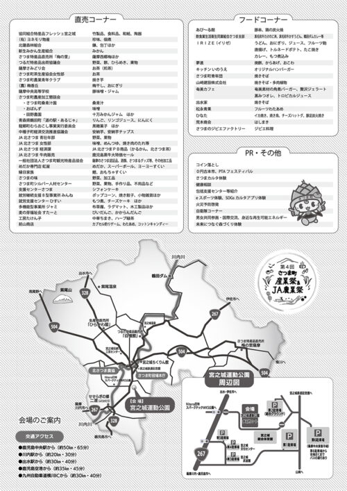 会場では、さつま町の新鮮な農林産物や特産品の販売、フードコーナー、マルシェ、体験コーナー、ステージイベントなど、見どころが盛りだくさん!